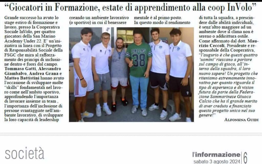 Quattro calciatori della San Marino Academy Under 22 hanno svolto un’esperienza di Formazione e Lavoro presso la Cooperativa Sociale InVolo, Un’esperienza volta ad insegnare loro valori importanti, un bagaglio da riportare in futuro nelle proprie esperienze di vita, ma soprattutto nel campo di calcio!